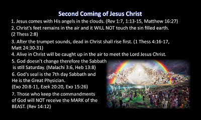 As prophesied, there is a small number of Christians that have gone forth all around the world to declare that Sunday is the mark of the beast and the seventh day Sabbath is the seal of the Creator God. Soon their message will swell into a LOUD CRY. This message will only be proclaimed by the child of God that studies Bible prophecy and obeys the God that wrote it. We implore all to make their paths straight for the coming of the Lord, as it is now VERY near. It is the prayer of the remnant people of God that what you find on this website moves you into a closer relationship with the Lord Jesus Christ who is very soon to return.